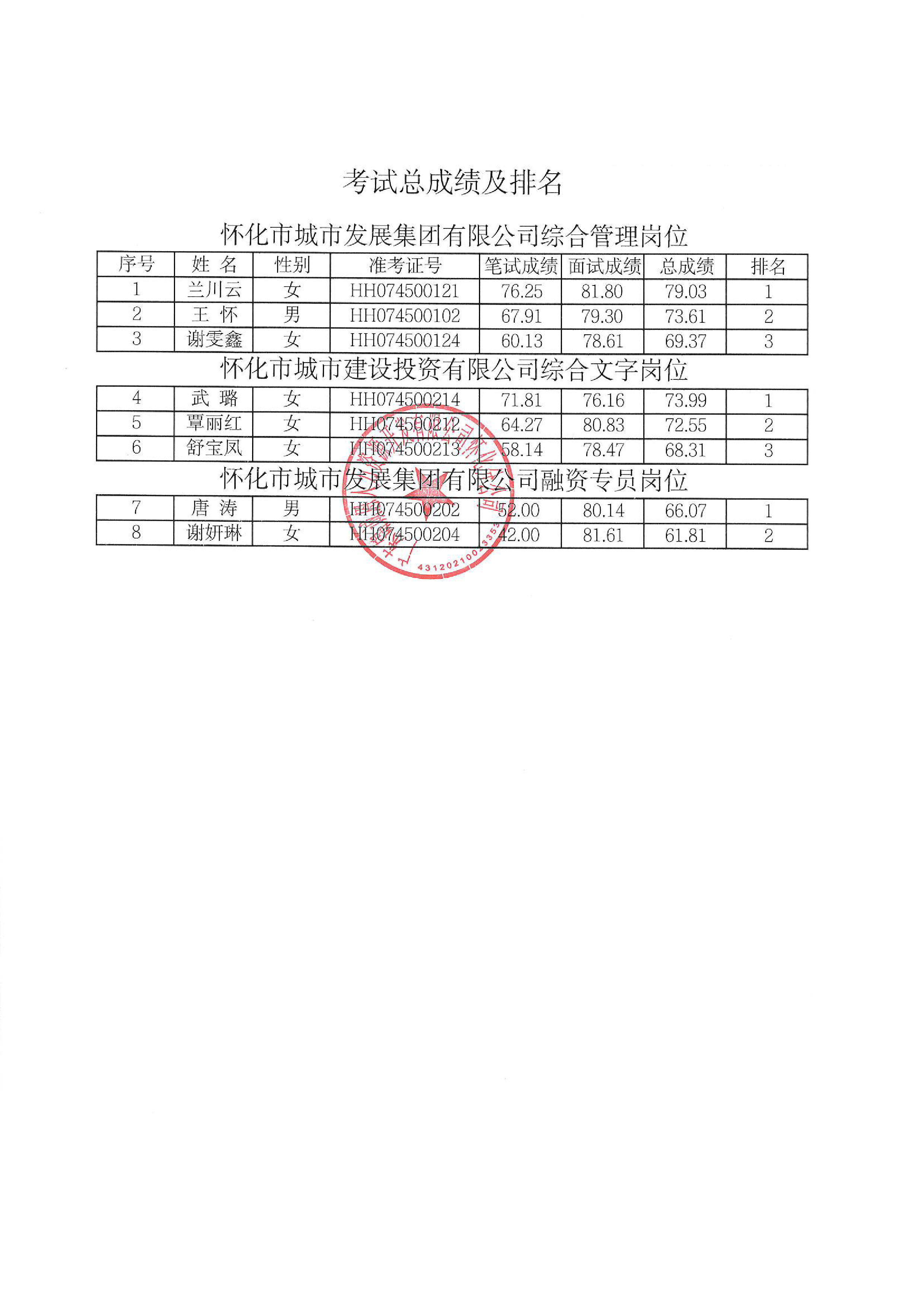懷化市城市發展集團有限公司2023年校園招聘面試入圍考生考試總成績及排名