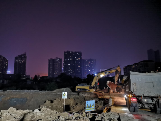 太平溪地下停車場加班進行土方挖運施工
