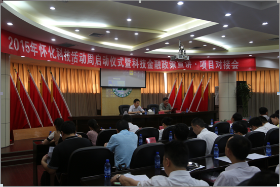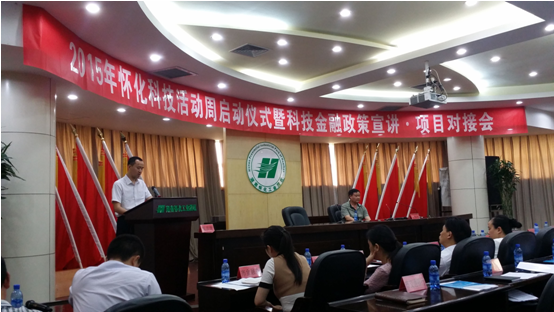 5月19日,2015年懷化科技活動(dòng)周啟動(dòng)式暨科技金融政策宣講·項(xiàng)目對接會(huì)在懷化工業(yè)園區(qū)舉行。來自懷化市直相關(guān)部門、各商業(yè)銀行、有關(guān)金融機(jī)構(gòu)、50多家科技型企業(yè),以及各縣市區(qū)科技局、經(jīng)信局和工業(yè)集中區(qū)管委會(huì)代表等150余人參加活動(dòng)。懷化市人民政府副市長楊開鳳宣布活動(dòng)正式啟動(dòng)。