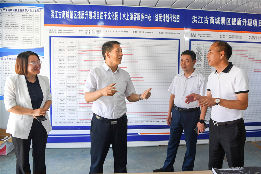 (許忠建在洪江古商城了解屈子江閣、水上游客服務中心等景區提質改造項目進展情況。以上照片均由懷化日報全媒體記者 楊智偉 攝)