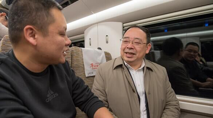 1月11日,省政協委員彭鈞在高鐵上接受懷化日報記者的采訪。(記者 潘雨 攝)
