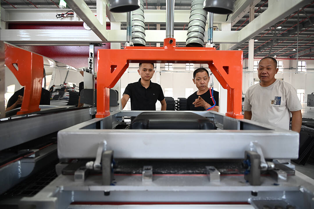 在湖南享懷箱包加工生產(chǎn)基地,一條條現(xiàn)代化的生產(chǎn)線整齊排列著,機(jī)器的轟鳴聲此起彼伏。流水線上,工人們熟練地操作著全自動注塑機(jī)、全自動縫線機(jī)等各種設(shè)備,裁剪、縫制、打包等一項項流程有條不紊地進(jìn)行著。